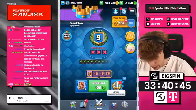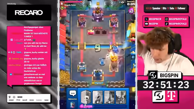 00:08:40Nach anfänglichen Schwierigkeiten wird das Turnier über einen QR-Code und einen Link im Chat gefunden und beigetreten. Es sind über 1.300 Teilnehmer, und der Streamer nutzt ein Deck bestehend aus Ghost, Royal Hawks, Lightning, Baby Dragon und Eismagier. Während des Turniers treten technische Probleme, insbesondere bei der iPad-Verbindung, auf, die zu Lags und verzögertem Spielverhalten führen. Der Streamer kämpft sich jedoch durch verschiedene Gegner und gewinnt einige Runden, wobei er seine Platzierung im Turnier kontinuierlich verbessert.