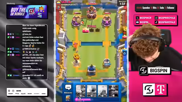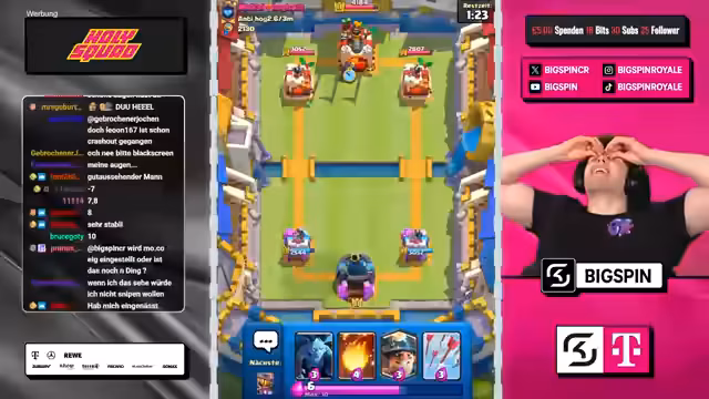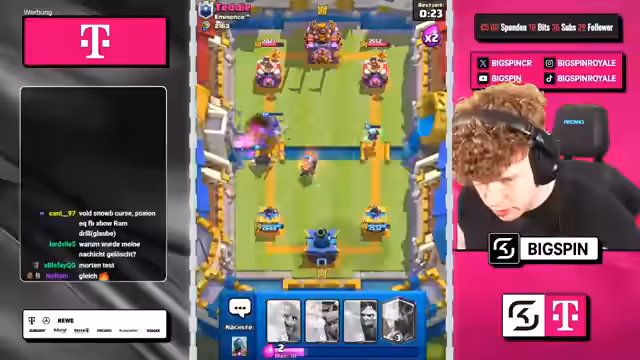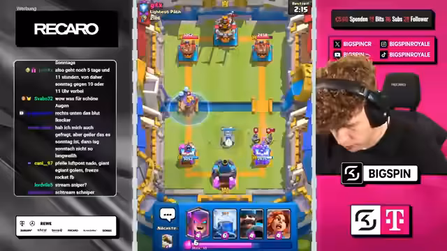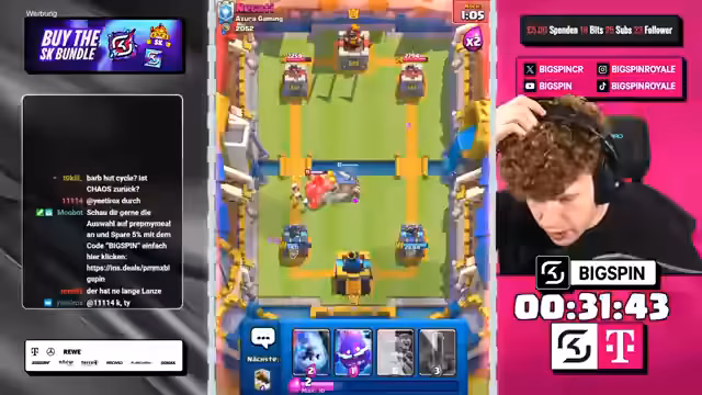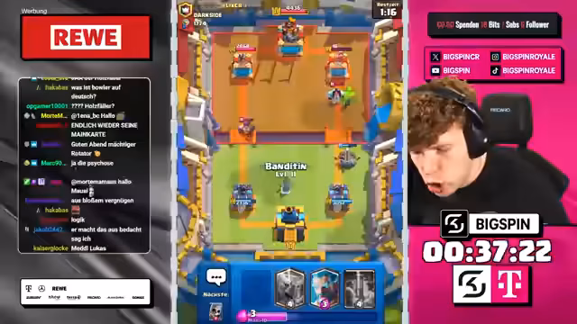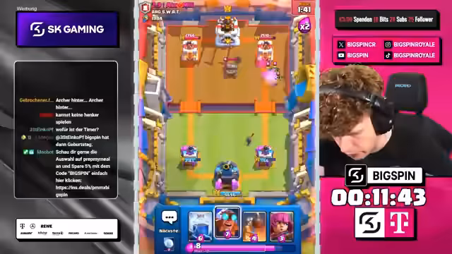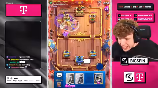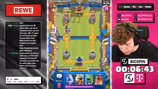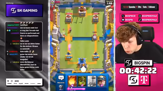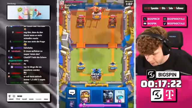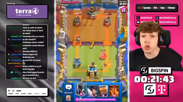 00:00:00Der Stream beginnt mit dem Moderator 'bigspincr', der einen LiveStream mit dem Titel 'CHATGPT WÄHLT MEINE KARTEN in 3x AUSWAHL -> NUR RECHTE KARTEN WÄHLEN -> NEUES FRIEDHOF DECK VON OG-PRO!' ankündigt. Es geht um ein Clash-Royal-Spiel, bei dem ChatGPT die Karten für den Streamer auswählt. Der Streamer ist begeistert und freut sich auf die Zusammenarbeit mit ChatGPT, um in die Top 1000 der Rangliste zu kommen.