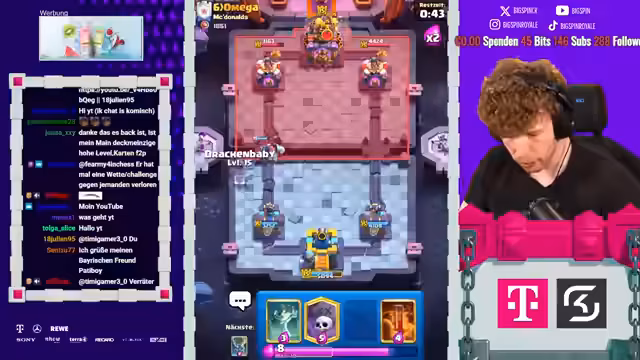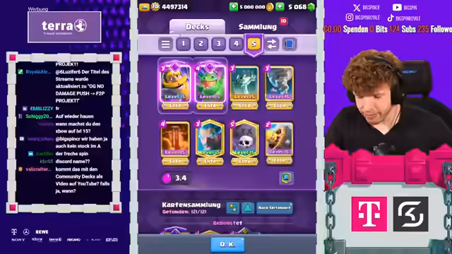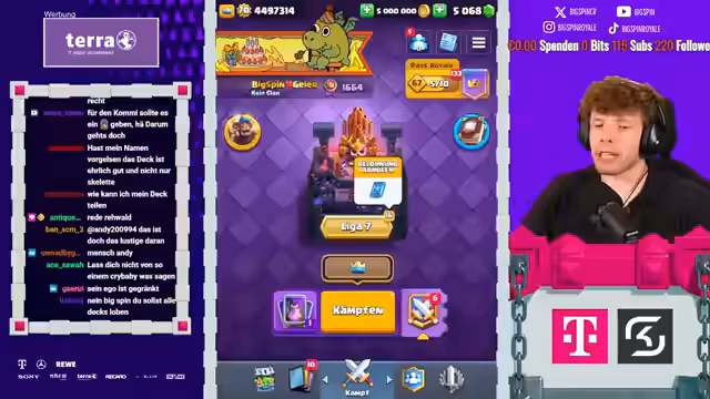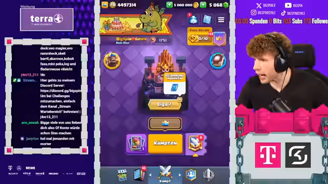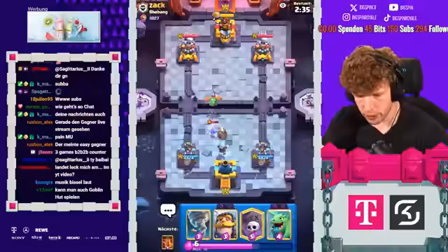 00:00:01Der Stream startet mit großer Vorfreude und einer Insta-Ankündigung im Chat. Der Fokus liegt auf drei Hauptzielen: Zuerst wird das vom letzten Gegner geklaute Deck, ein Pekka-Rambock-Henker-Deck, in Liga 5 weitergespielt. Anschließend folgt der Zuschauer-Format, bei dem der Streamer von den Chat-Teilnehmern deren Decks beibräßen lassen soll. Zum Schluss ist ein OG No Damage Push sowie ein Versuch, den Free-to-Play-Plus-Pass zu öffnen, um auf 15.000 Trophäen zu kommen, angesetzt.