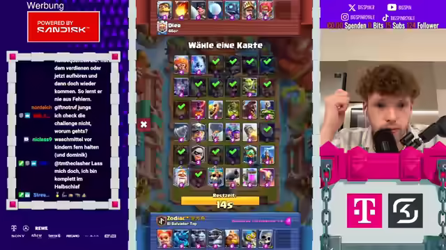 03:12:23Der Streamer gibt bekannt, dass er den Gewinner mit 10 Tabs belohnen wird und sich dann verabschiedet, da er keine Lust mehr hat. Er bietet an, die Gründe dafür später im Stream zu erläutern. Nach seinem Ausscheiden analysiert der verbleibende Streamer die Karten und Strategien des laufenden Spiels. Er äußert den Wunsch, Solik nicht zu verletzen und betont, dass die vorherige Diskussion keine 'diepe Sache' war und er nicht erwartet hatte, dass sie jemanden so verletzen könnte. Es wird überlegt, ob eine Frage im Chat 'krank' ist und ob die Antwort 'nein' lauten sollte. Der Streamer gibt bekannt, dass Zodiac seinen Abschied verkündet hat und äußert seine Trauer darüber. Er analysiert die Decks der Gegner und stellt fest, dass er gegen ein sehr starkes Deck spielen muss. Es wird überlegt, ob der Inferno Tower generft werden sollte. Der Streamer hadert mit seiner Kartenwahl und ist unzufrieden mit seinem Deck. Er schlägt vor, die Regeln zu verschärfen und bis zu zwei Niederlagen zu spielen.