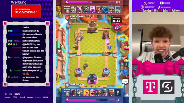 01:01:22Es wird diskutiert, warum EQ als Last Pick genommen werden durfte, was zu humorvollen Kommentaren über Bigspins Spielweise führt. Die Community wird aktiv einbezogen, indem Fragen beantwortet und auf Kommentare eingegangen wird. Es wird über die beste Werbung gesprochen und der Gewinner des Spiels wird beglückwünscht. Es wird auf Code Bigspin gespielt und die Bedeutung von Creator-Codes hervorgehoben. Es wird sich über die beste Karte im Spiel ausgetauscht und sich bei der Community für Spenden bedankt.