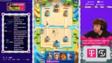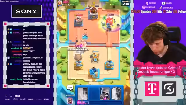 00:11:41Nach den ersten Runden wird die Grand Challenge absolviert. Der Streamer spielt weiter und analysiert die Decks seiner Gegner. Er konfrontiert sich mit verschiedenen Builds wie Log und Eisgeist sowie Bait-Decks mit Goblin Barrel und Rekruten. Er zeigt Frustration über Matchups gegen Decks mit starken Kontern, gegen die das X-Bogen-Deck keine Karten hat, wie Skelly Dragons oder Rekruten. Dabei betont er die strategischen Fehler der Gegner und seine eigenen Unsicherheiten aufgrund seiner Erkrankung.