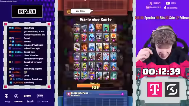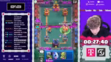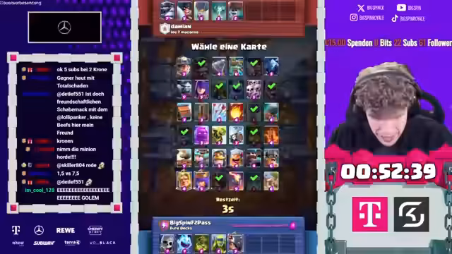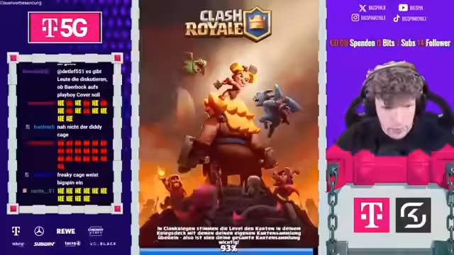 00:47:30Der Stream beginnt mit einem 1vs1-Spiel, bei dem der Streamer mit einem Spin-Deck gegen ein unkonventionelles Gegner-Deck mit Pekka, Ritter und Henker antritt. Beide Spieler zeigen taktisches Verhalten, da der Gegner den Turm des Streamers angreift, während der Streamer den Gegner mit Schadensvorteilen unter Druck setzt. Das Spiel verläuft intensiv und wild, wobei beide Seiten ihre Truppen wie Ghost, Banditen und Packer strategisch einsetzen, um dem Gegner die Kontrolle über das Spiel zu entreißen.