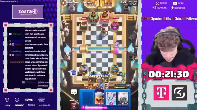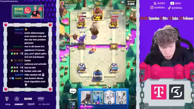 02:11:04Der Stream startet mit der Besprechung der anstehenden 2vs2-Partie gegen 21:20 Uhr. Der Fokus liegt auf den eingesetzten Karten, wie Scallyjacks, Lightning, Baby Dragon und einem Tester. Der Streamer analysiert kontinuierlich die Spielsituation, den Kartenvorteil und stellt strategische Überlegungen an, wie er das offensiv geprägte Game trotz eines Damage-Nachteils gewinnen kann. Das Spiel ist von schnellen Aktionen, dem Einsatz von Spells wie Lightning und Pfeilen sowie dem ständigen Bemühen, den Gegner unter Druck zu setzen, geprägt.