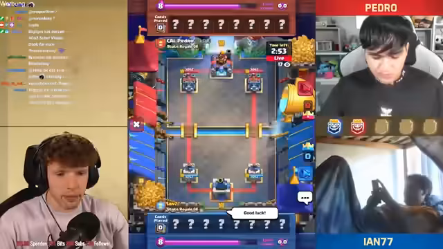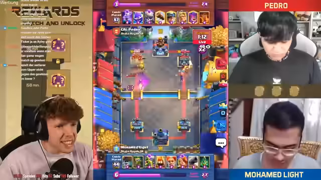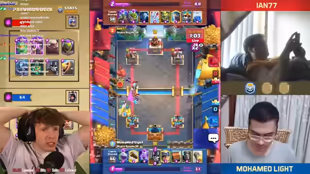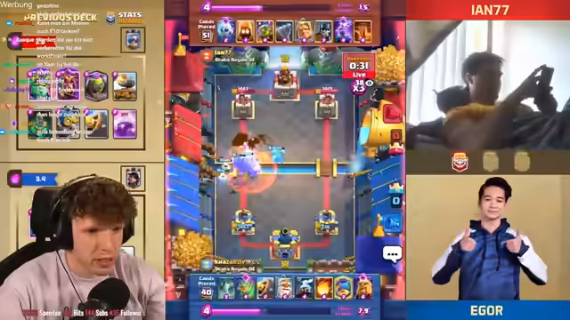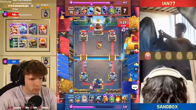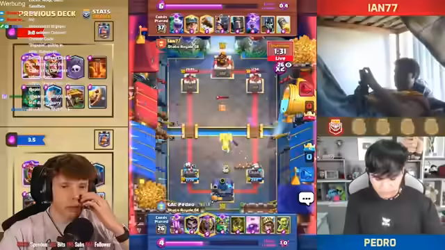 08:29:31Es wird betont, wie wichtig der Schaden am Kingpaw war, um das Spiel zu gewinnen. Es folgt ein Spiel gegen Mohamed, bei dem der Streamer eine gute Interaktion für sich erzielt. Der Baby-Dragon macht extrem viel Damage und bringt den Turm auf 225. Der Streamer gewinnt das Game mit 1:0 gegen Mohamed. Er analysiert, dass er extra etwas höher gespielt hat, damit der Quäcker nicht so am Turm ist. Trotzdem kann der Gegner noch gewinnen, was nervt. Der Streamer befindet sich in einer sehr guten Situation und ist wieder in seinem Cycle. Der Gegner setzt eine Crackerin, die aber draufgeht, was sehr wichtig ist. Am Ende gewinnt der Streamer das Game ohne Golem und Pumpe. Er erreicht Platz 7 wieder. Es folgt ein Spiel gegen Levin, der sehr gut mit Golem ist. Es ist ein Golem-Mirror-Match. Der Streamer hat Respekt vor dem Gegner. Er überlegt, ob er Hexe spielt, aber der Gegner hat keine Gognon-Machine im Cycle. Der Ofen greift auf der anderen Seite an, was belastend ist, aber passt. Der Turm geht down. Es folgt ein Spiel gegen einen unbekannten Gegner, bei dem der Streamer die Hexe reinspielt und die Maschine knickt. Der Gegner spielt nicht gut, und der Streamer gewinnt das Game. Er ist nur noch ein Game von Platz 1 der Welt entfernt und erreicht Platz 2.