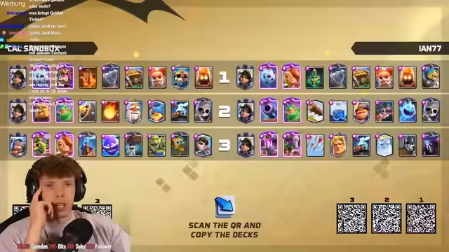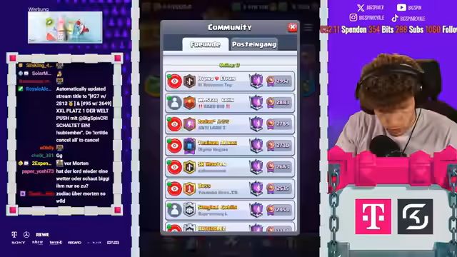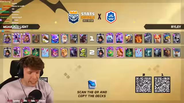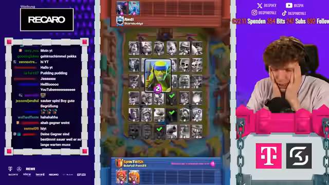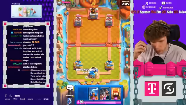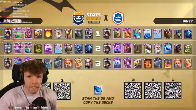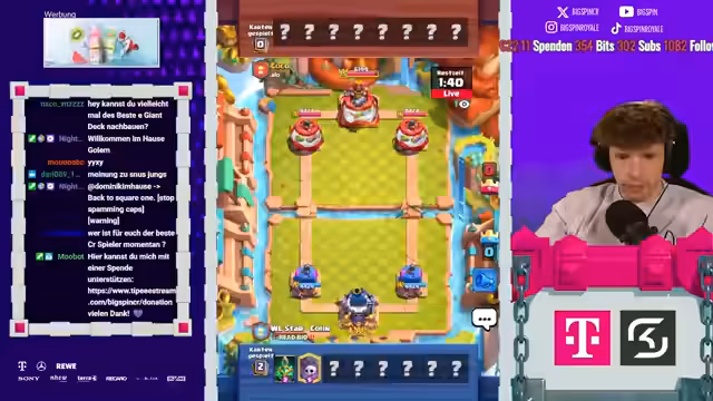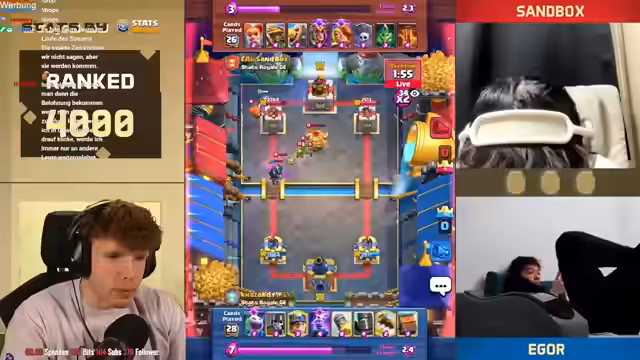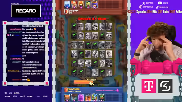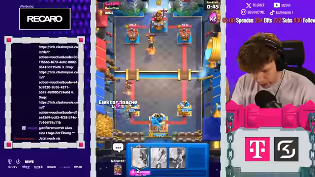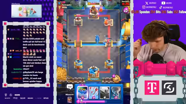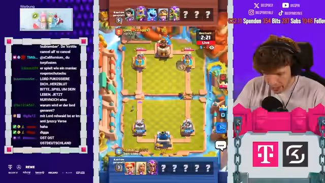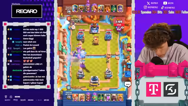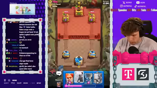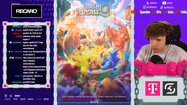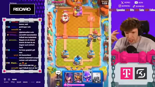 08:18:06Es stehen neue Karten im Shop und ein neues Game an. Der Streamer ist nur noch zwei Games von Platz 1 der Welt entfernt und spielt gegen Fan. Die letzten drei Male hat er immer gegen ihn gewonnen. Der Gegner setzt einen Ballon direkt an der Brücke, aber der Streamer kontert mit Weinz-Barban. Der Gegner spielt gut, aber der Streamer weiß, was er macht. Es folgt ein Spiel gegen Samelane, was als nervig empfunden wird, da er alle Truppen zurückhalten kann. Der Streamer kommt nicht mehr durch und muss den Gegner lassen. Er analysiert, dass der Gegner besser gespielt hat als in den vorherigen Matches. Mit 3:1 verliert der Streamer, was ärgerlich ist. Als nächstes würde Hypno extrem nerven, da das Matchup unmöglich ist. Es folgt ein Spiel gegen einen unbekannten Gegner, der Riss Swam spielt. Der Streamer ist unsicher, wie gut er dagegen ist, da der Gegner den Minipacker hat. Er ahnt die Züge des Gegners voraus und kann die Hexe verteidigen. Ein perfekter Baby Dragon führt dazu, dass es beim Gegner kracht. Der Streamer weiß immer, was die Gegner machen und hat den passenden Pay parat. Die Evo Rallys des Gegners nerven, aber der Streamer kann die Situation meistern. Am Ende gewinnt er das Game, was ihm die nächste Rage von seinem Gegner einbringt.