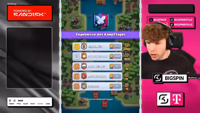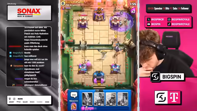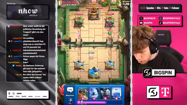 02:18:19Der Stream startet mit der Auswertung eines gespielten Spiels, bei dem das Spielstandverhältnis 6:2 Siege zugunsten des Streamers ausfiel. Der Fokus liegt auf der Analyse der Kartenauswahl und des Spielverlaufs. Der Gegner nutzt ein mit Prinzessin und Rakete bestücktes Deck. Der Streamer entscheidet sich für ein solides Deck mit Henker, Holzfällen und Busch, um den gegnerischen Angriffen standhalten zu können.