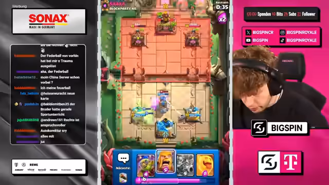 00:35:13Ein Highlight des Streams ist der Wechsel in einen exklusiven China Server Modus, den der Streamer mit einem Duo-Spieler ausprobiert. Hier müssen in jedem Spiel neue Karten-Upgrades gewählt werden, um den Golem so lange wie möglich am Leben zu halten. Nach anfänglichen Schwierigkeiten gelingt es, ein nahezu perfektes Loadout mit Dart Goblin, Spell Rage und weiteren Upgrades zu erstellen, was zu einem beeindruckenden Rekord von 53 Wellen führt.