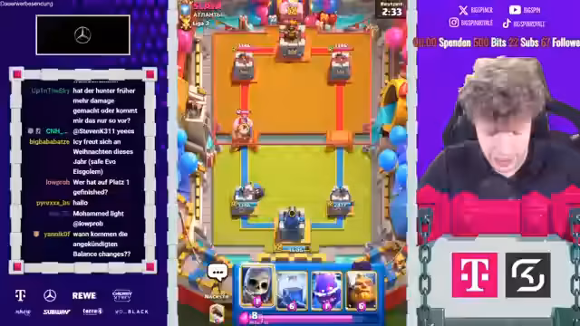 02:37:29Der Streamer interagiert intensiv mit dem Chat und fordert Meinungen zur Evo-Hunter-Karte ein. Die allgemeine Tendenz des Streams ist, dass die Karte weder als "zu stark" (broken) noch als zu schwach eingestuft wird, sondern eine gute Balance gefunden zu haben scheint. Sie ist in bestimmten Decks, wie dem Royal-Giant-Deck, extrem stark, aber keine Allzweckwaffe. Die Betonung liegt auf der Tatsache, dass sie gezielt gegen bestimmte Truppen, die sich schlecht bewegen können, maximale Wirkung entfaltet und für andere Matchups weniger geeignet ist.