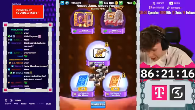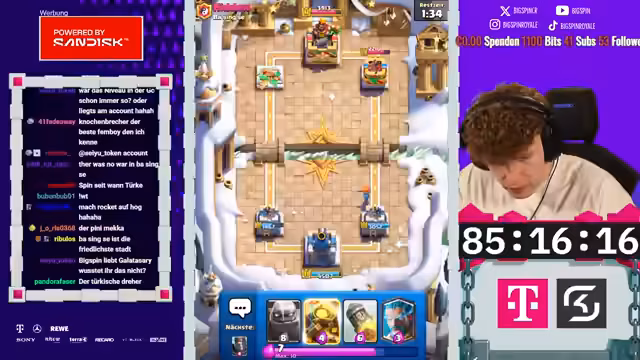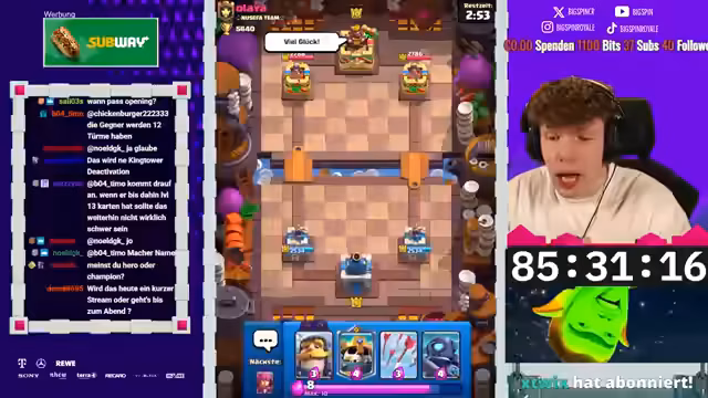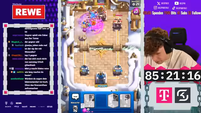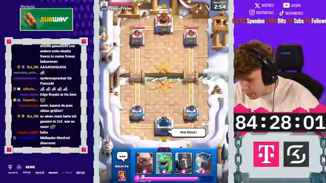 00:00:00Der Stream beginnt mit einer Ankündigung eines circa zweistündigen Nachmittagsstreams. Hauptziel ist der erste Champion-Free-to-Play-Fortschritt. Nachdem ein Clan-War-Match schnell gewonnen wurde, um den Spin-Bonus zu erhalten, soll die Grand Challenge gespielt werden. Dort ist der erste Champion bereits in Reichweite, mit dem Angebot, den Golden Knight oder Skelly King auf Level 11 freizuschalten. Das F2P-Projekt konzentriert sich auf das Ausspielen der Grand Challenges, um Fortschritt zu machen und Karten zu upgraden.