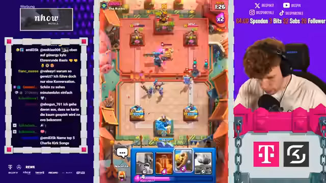 01:40:16In der neuen Partie gegen Dailen aus Team Guate beginnt der Streamer mit Baby-Drachen und Skeletten als erste Verteidigung gegen den gegnerischen Drill. Die aggressive Strategie, frühzeitig einen Lightning-Zauber einzusetzen, zielt darauf ab, gegnerische Bodentruppen zu schwächen. Der Gegner offenbart ein Bait-Deck mit einer Hütte, was zu einer potenziellen King Tower Activation führen könnte, die jedoch aufgrund des unterlevelten Scalibails des Gegners unwahrscheinlich ist. Ein Bowler wird für den nächsten Drill des Gegners vorbereitet, während ein Cage mittig platziert wird. Der E-Giant erweist sich als effektiv gegen die gegnerischen Bodentruppen, und ein Baby-Drachen schützt den Bowler. Ein Feuerball des Gegners kann die Offensive kurzzeitig unterbrechen, aber die Gesamtstrategie bleibt darauf ausgerichtet, den E-Giant und Baby-Drachen im späteren Spiel zu nutzen, um den Sieg zu sichern, auch wenn man anfangs zurückliegt.