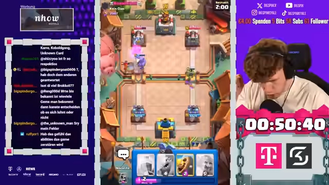 01:49:36Das Matchup erweist sich als äußerst schwierig, da der Gegner über Lightning, Pekka und Fischer verfügt, was eine effektive Verteidigung nahezu unmöglich macht. Der Streamer hat Schwierigkeiten, dieses Spiel zu gewinnen, da die eigenen Karten nicht ausreichen, um den Gegner zu kontern. Ein Nado wird eingesetzt, um die Verteidigung zu stärken, aber die Situation bleibt angespannt. Der Gegner spielt erneut einen Kanonenmann, was zu Frustration führt, da dies bereits das dritte oder vierte Matchup mit dieser Karte ist. Ein Baby-Drachen wird platziert, um die Valkyrie des Gegners zu neutralisieren. Der Gegner spielt ein zufälliges Ballon-Deck mit Evo-Valkyrie, Kanonenmann und Stein, was eine weitere Herausforderung darstellt. Der Streamer fühlt sich überfordert, da der Gegner scheinbar jede Karte im Deck hat, die gegen ihn effektiv ist. Trotzdem gelingt es, das Spiel zu gewinnen, was auf eine gute Spielweise hindeutet, auch wenn der Gegner scheinbar alle Vorteile hatte.