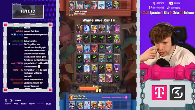 00:13:03Die zweite Partie beginnt ebenfalls mit Skeletten, gefolgt vom Bomber. Die Wahl der Karten wird zunehmend komplexer, da der Streamer vorausschauend planen muss, welche teuren Karten noch zur Verfügung stehen werden. Er wählt Pfeile als Small Spell und die Koboldhütte, um gegen den gegnerischen Ballon und andere Einheiten vorzugehen. Für 5 Elixier entscheidet er sich für die Kanonenkarre, da der Gegner wenig dagegen hat. Die Herausforderung spitzt sich zu, als er den Lavahund und anschließend die Barbarenhütte wählen muss, was zu einem ungewöhnlichen Deck führt. Trotz der scheinbar ungünstigen Kombination gelingt es ihm, das Spiel durch geschickte Platzierung und Nutzung der Boss-Banditin zu gewinnen, was ihn auf 2:0 in Führung bringt.