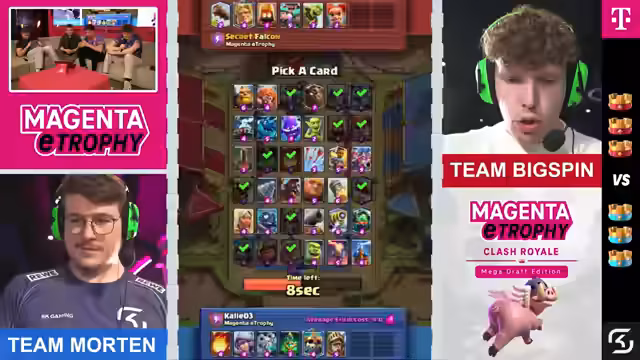 01:29:17Nach Max' Sieg trat der nächste Spieler von Morton, Secret Falcon, an. Das Draft für das Spiel gegen Max war erneut ungewöhnlich, wobei Max den Monk und Dark Prince wählte. Dies erzeugte eine starke Offensivdruck, während Secret Falcon versuchte, mit Three Musketeers, Bomber und Golem durchzudringen. Die Analysten waren sich uneinig über die Stärke der Decks, da Monks die neuen Three Musketeers kontert, während andere Karten wie Hexe und Hog Rider im Draft als schwach eingestuft wurden. Es wurde erwähnt, dass der Modus 'King of the Hill' die Dynamik verändert, da ein Spieler durch kontinuierliche Siege bis zur Niederlage im Spiel bleibt.