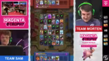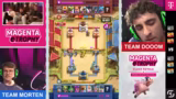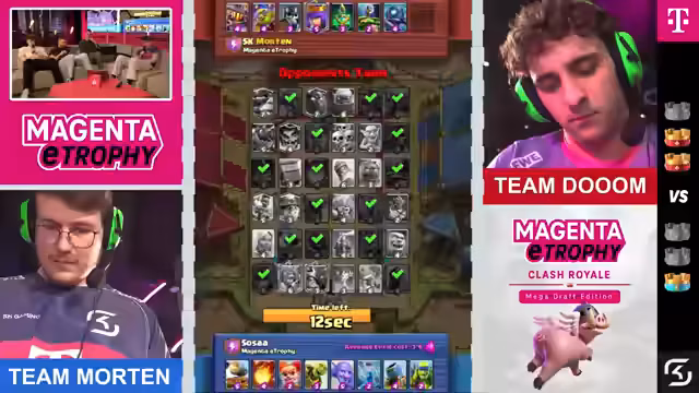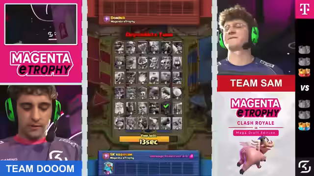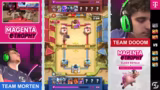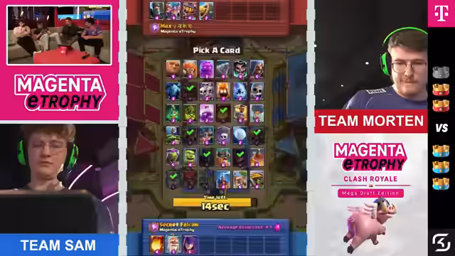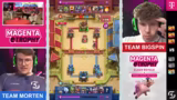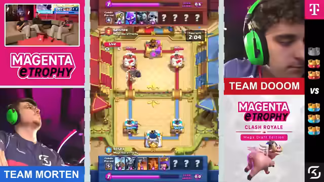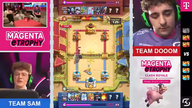 01:17:08Für das zweite Match zwischen Team Morton und Team Sam wurden die Paarungen bekanntgegeben: Geister von Morton spielte gegen Max von Sam. Die Draft-Phase war komplex und voller unerwarteter Picks. Beide Teams unternahmen unkonventionelle Züge, wobei Max beispielsweise Elixir Golem und Geister Ghost, Geister Kaiser wählte. Dies führte zu einem sehr unübersichtlichen und taktisch komplizierten Spiel mit vielen ungewöhnlichen Entscheidungen und Karteninteraktionen.