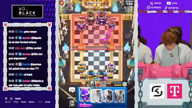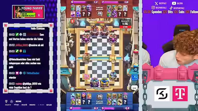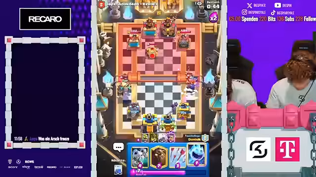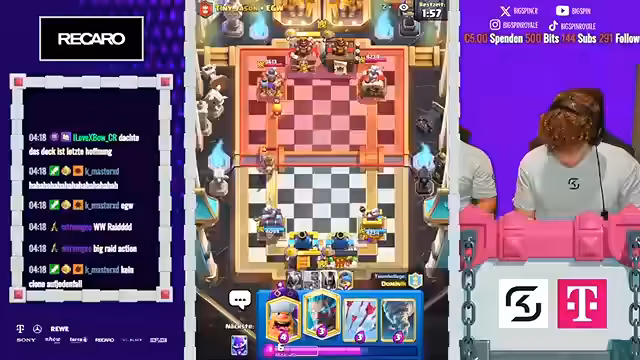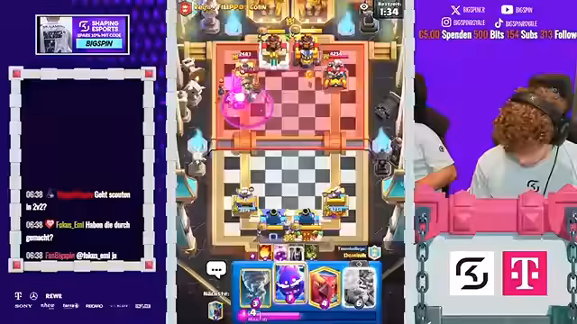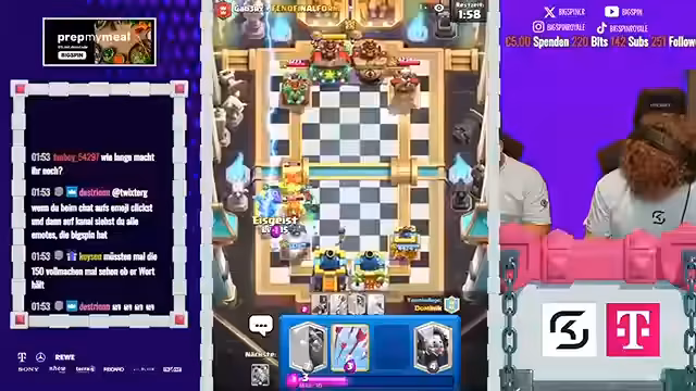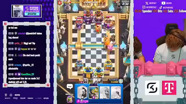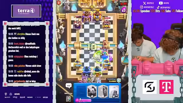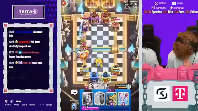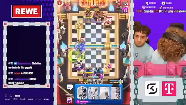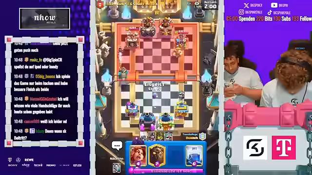 12:09:21Das Finale des 2vs2-Turniers stand im Zeichen ständiger Überraschungen und umkämpfter Spiele. Der Streamer beschreibt, wie Gegner überrascht wurden und auch selbst eine Gegenübererraschung gelang. Die Spiele wurden als verrückt und intensiv bezeichnet. Dabei kam es immer wieder zu Diskussionen über Spielstrategien und die Wahl der richtigen Karten, wobei speziell Karten wie P.E.K.K.A. und Boss-Bandite eine zentrale Rolle spielten und oft kritisiert wurden.