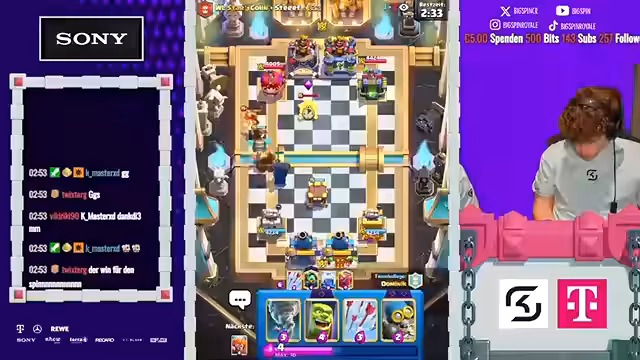 00:01:45Das Finale beginnt und das Team, bestehend aus dem Streamer und Dominik, startet eine beeindruckende Siegesserie. Sie spielen mit einem optimierten Deck, das Doppel-Mega-Ritter und Evo-Zap enthält, und dominieren ihre Gegner. Besonders hervorzuheben ist der kl Sieg gegen den aktuellen Platz-1-Spieler der Welt. Dieser Erfolg wird als Meilenstein gefeiert, da es der erste Sieg gegen einen derart hoch platzierten Gegner ist und sie sich in die Top 5000 vorspielen.