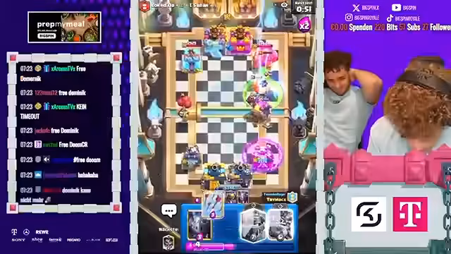 00:50:19Das 2vs2 Finale beginnt mit einem sehr spannenden und knappen Match. Streamer und sein Partner setzen auf eine aggressive Strategie mit MK und Evo-Dart-Goblin. Sie versuchen, den Gegner unter Druck zu setzen, müssen aber ständig verteidigen und passen genau auf die gegnerischen Züge auf, um nicht ins Hintertreffen zu geraten. Das Spielverlauf ist geprägt von schnellen Entscheidungen und der Notwendigkeit, die eigenen Karten effizient zu cycle.