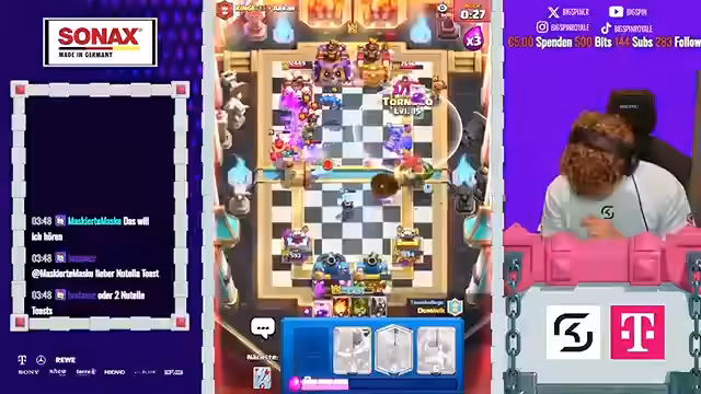 04:17:30Das Stream-Segment zeigt die Durchführung von erfolgreichen Verteidigungsstrategien, wobei der Streamer ein "Megamenü" am Spielrand identifiziert und darauf reagiert. Nach der Abwehr eines Angriffs wird der Gegner als extrem sauer beschrieben, was den Druck erhöht. Spielerisch geht es um das Ausbalancieren von Elixir-Einnahmen und -Ausgaben, wobei der Streamer seine Position in der Weltrangliste auf Platz 24 beziffert und die Jagd auf Konkurrenten ankündigt, die sich auf den vorderen Rängen befinden.