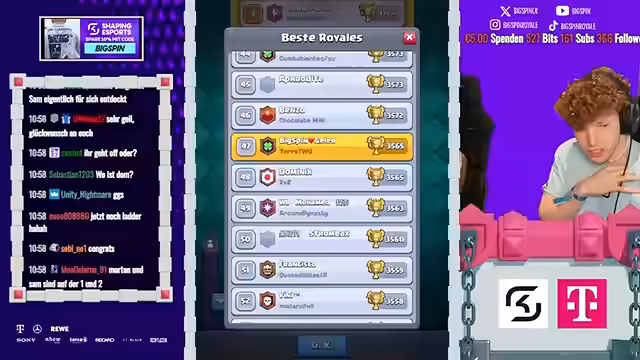 01:42:32Die Vorbereitungen für den angekündigten XXL Platz 1 Push laufen auf Hochtouren. Der Streamer stellt sein Deck mit Evo Bomber auf und stimmt sich mit Dominik ab. Die Zusammenarbeit mit Dominik, der als "DoomCR" betitelt wird, steht im Mittelpunkt. Das Ziel ist klar, Platz 1 in der globalen Rangliste zu erreichen. Die Stimmung ist hochmotiviert und der Fokus liegt darauf, ein spektakuläres Stream-Erlebnis für die Zuschauer zu gestalten.