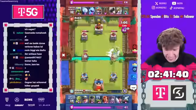 01:34:03Der Streamer konfrontiert einen Gegner mit Warbreaker und setzt Runenriesen ein, um gegenzuhalten. Er erwähnt einen nicht optimalen Cycle und setzt Zappen ein, um die gegnerische Armee zu schwächen. Trotzdem spielt er die Maschine rein, um den Turm des Gegners anzugreifen. Der Streamer geht aggressiv vor, da der Gegner keine Walküre mehr hat, wird aber von einer Kanone gestört. Er ist sich sicher, dass der nächste Push erfolgreich sein wird und setzt den Inferno Dragon ein, um den Gegner zu kontrollieren. Der Streamer setzt Runenriesen ein, um den Gegner zu zwingen, zu reagieren, und nutzt den Zapp, um die gegnerischen Einheiten zu schwächen. Er beschreibt das Matchup als lästig und betont, dass seine einzige Chance darin besteht, dass der Gegner keine Kanone hat. Der Streamer gibt nicht auf und setzt den Evo-Sip ein, um den Gegner unter Druck zu setzen. Er zappt den Dartgoblin und setzt Pfeile ein, um Schaden zu verursachen. Trotzdem reicht der Schaden der Runenriesen nicht aus, um den Turm zu zerstören. Der Streamer spielt den Inferno-Drachen und den Boot-Zauber, um den Gegner zu kontrollieren. Er kritisiert die stupide Spielweise des Gegners und setzt Garden ein, um den Gegner am Angriff zu hindern. Der Streamer erwähnt einen Barrel und setzt Zepp ein, um den Gegner zu kontrollieren. Er plant, mit dem Goblin Giant und dem Inferno Dragon einen Kai zu performen und Value zu generieren. Der Streamer befürchtet einen Elektro-Dragon des Gegners, setzt aber die Goblin-Machine ein und bufft sie mit Rage und Zap. Trotz eines massiven Elixiervorsprungs des Gegners und des Einsatzes von P.E.K.K.A. und Lockbait gibt der Streamer nicht auf.