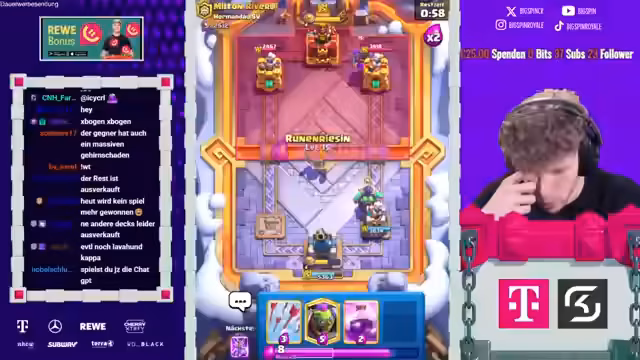 00:03:01Der Streamer startet das erste Spiel, bei dem er nur linke Karten auswählt. Er distanziert sich von Aussagen in einem Video eines Zuschauers und konzentriert sich auf das Spiel. Trotz einer anfänglich nicht idealen Kartenauswahl sieht er Potenzial in der Kombination aus Crackerin, Walküre und Eichhörnchen. Er setzt einen Minenwerfer ein, woraufhin der Gegner mit der Hexenmutter kontert, was der Streamer als Fehler ansieht. Der Gegner aktiviert den King Tower mit einem Blitzzauber und spielt dann einen Bowler, was der Streamer als unsinniges Spiel wertet, da der Gegner scheinbar nicht online ist. Der Streamer setzt auf den Eierwerfer, um die gegnerische Offensive abzuwehren. Trotz des Verlusts des Minenwerfers und einer nicht idealen Situation, sieht es für den Streamer gut aus, da er die drei Musketierinnen einsetzen kann. Der Eierwerfer erweist sich als effektiv gegen die gegnerische Offensive, was dem Streamer einen Vorteil verschafft. Am Ende gewinnt der Streamer die Runde, obwohl es noch einmal knapp wurde.