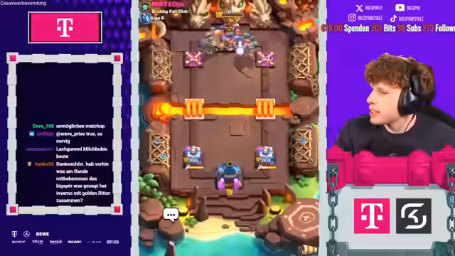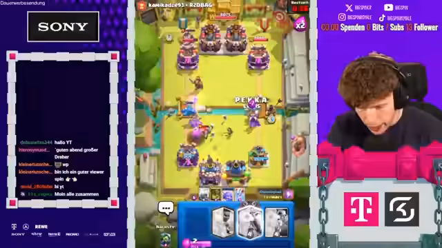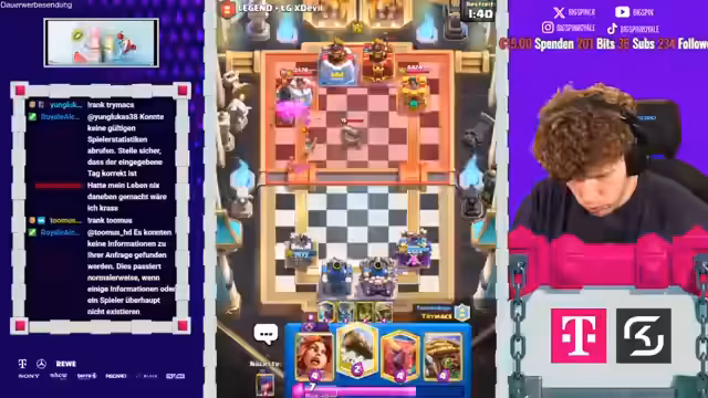 02:00:51Im Stream wird ein sehr aufregendes und stressiges Clash Royale-Spiel gezeigt, in dem die Streamer gemeinsam gegen einen Gegner antreten. Sie kommunizieren intensiv über strategische Züge wie das Setzen von 'Hütte', 'Lock' und 'Drill', um defensiv zu stehen und gleichzeitig Druck aufzubauen. Die Zusammenarbeit ist gefordert, um gegnerische Angriffe abzuwehren und eigene Kombinationen wie 'Poison' und 'Valkyrie' erfolgreich zu platzieren. Das Spiel endet knapp mit einem Sieg und plus 50 Trophäen, beendet zuvor aber eine Serie von fünf Niederlagen.
