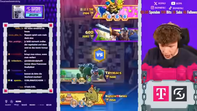 00:01:57Die ersten Spiele in der 2v2-Arena beginnen. Der Streamer und sein Partner trymacs, genannt Dominik, kommunizieren intensiv während der Matches. Dominik zeigt sich emotional und ruft oft, was zu humorvollen Momenten und Verwirrung im Chat führt. Die Gegner nutzen ebenfalls starke Decks wie Goblin Drill und Laberhund. Ein Schlüsselmoment entsteht, als Dominik den Einsatz eines Nado-Spells kritisiert, was zu einem klaren Vorteil für das Team führt. Die Spiele sind geprägt von schnellen Entscheidungen, gutem Timing und der Notwendigkeit, gegnerische Züge im Voraus zu lesen.