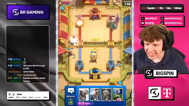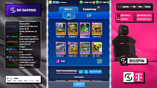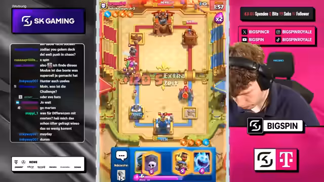 01:15:43Ein zentrales Thema des Streams ist die laufende Diskussion über die optimale Kartenauswahl und Strategie im aktuellen Chaos-Duell. Der Streamer experimentiert mit verschiedenen Kartenkombis, darunter Magier und Hütte, Ritter und Elektrogeist, und debattiert über die Vor- und Nachteile von Augments wie Ranken 100% Radius versus Wille Reiterung 100% Ansturmschaden. Der Fokus liegt auf dem Aufbau eines starken Decks mit Karten wie Pumarangholz, Holzfeller und Golem, wobei der gegnerische Pissofen als kritische Bedrofung identifiziert wird.