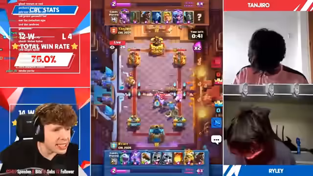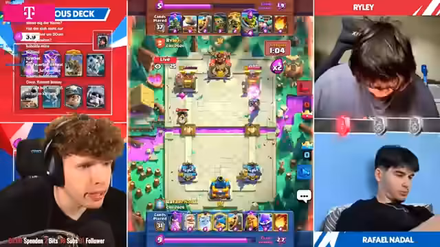 00:48:06Tanjiro nutzt ein Vogelbild-Deck mit Minions und Golden Knight, während Riley eine moderne 2.6 Variante mit Giant Skelly und Tesla spielt. Tanjiros Cam wird als besonders dynamisch beschrieben, was den Eindruck von mechanischen Bewegungen vermittelt. In einem spannenden Spiel gewinnt Tanjiro mit 1:0, wobei beide Türme nur knapp überleben. MK (Mega Knight) spielt eine entscheidende Rolle im Sieg von Tanjiro.