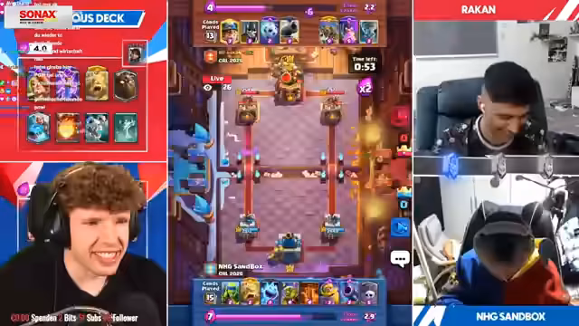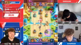 00:50:34Im zweiten Match zeigt Riley einen Drill Mirror, während Tanjiro unerwartet ein Ballon-Deck mit Schneeball spielt. Dieses Deck ist normalerweise im Clash Royale irrelevant, macht aber im Duel-Modus Sinn, da jede Karte nur einmal verwendet werden kann. Riley hat keine Anti-Air-Truppe neben Feuergeist und Mighty Miner, was ihn benachteiligt. Tanjiro nutzt dies aus, Riley gewinnt jedoch mit 1:1, da seine Mighty Miner und Schneeball stark gegen Tanjiros Ballon sind.