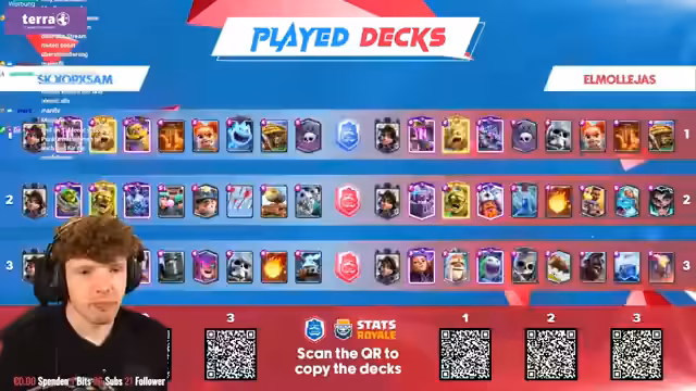 01:44:26Emolias zeigt sich in diesem Spiel überlegen mit seinem Deck. Er setzt den Infernoturm und die Crackerin sehr effektiv ein, was für Sam große Probleme bereitet. Sams Versuche, mit Giant Skelly und Dark Twins Druck aufzubauen, werden von Emolias erfolgreich gestoppt. Das Match zeigt, wie Emolias Sams Spielzüge perfekt antizipiert und kontert. Am Ende geht das Spiel trotz Sams Bemühungen an Emolias, was Sam ins Lower Bracket schickt.