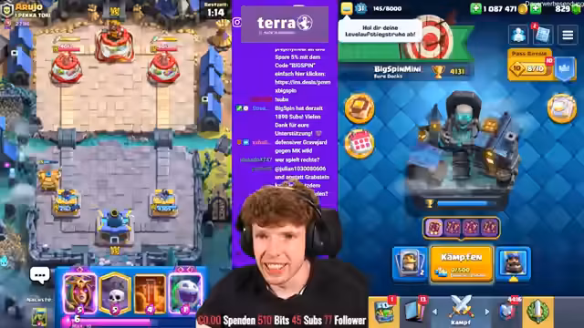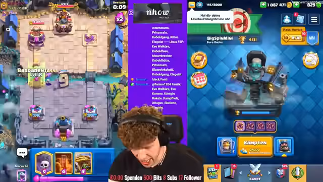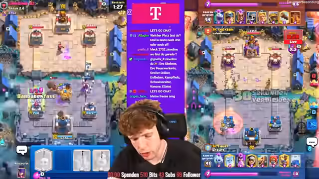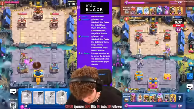 01:37:08Im späteren Verlauf des Streams versucht Dominik, einen entscheidenden Push zu machen, um die 3000 Trophäen-Marke zu erreichen. Er ist mit einem Score von 2991 nur noch knapp an der Zielmarke und muss ein wichtiges Game gegen einen Gegner mit dem Deck 'Hexenmutter' gewinnen. Der Gegner nutzt eine gute Soft-Defense mit Pfeilen, was den Sieg unmöglich macht. Trotz der Niederlage und des frustrierenden Matchups gibt er nicht auf und motiviert sich und den Chat für die verbleibenden Spiele. Er kündigt an, sich kurz zurückzuziehen, um technische Einstellungen zu prüfen, und verspricht, zurückzukommen, um weiterzuspielen.