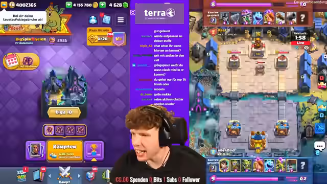 01:08:23Zu Beginn des Streams gibt es eine hitzige Diskussion über den Einsatz verschiedener Accounts, insbesondere zwischen Markus und Zodiac. Zodiac ist auf 3000 Trophäen, während Markus 18.000 Siege hat. Zodiac klagt über schwierige Gegner wie Evo Cracker und Valkyre und beschreibt das Matchup als unmöglich, da der Gegner fast jede Karte kontert. Es herrscht große Verwirrung darüber, welchen Account man nun einsetzen soll und wie die Account-Strategie aussieht, ohne den Main-Account aufzugeben.