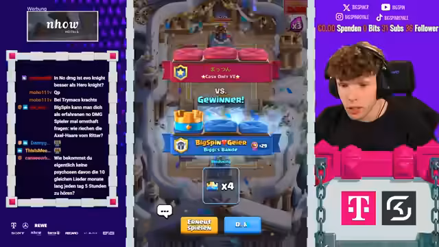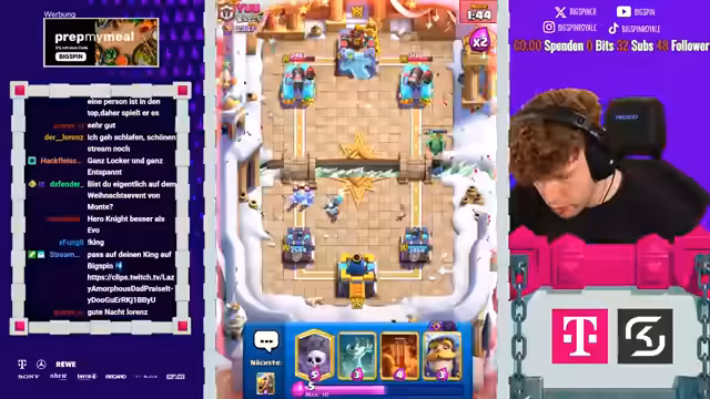 01:27:39Nach einer Serie von Siegen wird ein neues Deck mit einem Evo-Bomber ausprobiert, das jedoch als „kompletter Müll“ bezeichnet wird. Trotzdem wird versucht, das Spiel zu gewinnen. Der Gegner, Zarkos aus Les Patriotes, setzt auf Level-16-Karten, was die Herausforderung erhöht. Eine Kombination aus Geisterkaiserin und Schneeball wird eingesetzt, um die gegnerische Hexe zu kontern. Ein Mortar wird platziert, doch der Gegner reagiert mit einem Tesla, was die Situation erschwert. Ein Freeze wird strategisch eingesetzt, um die gegnerischen Truppen zu kontrollieren. Trotz aller Bemühungen gelingt es nicht, den gegnerischen Turm zu durchbrechen, und das Spiel endet in einer frustrierenden Niederlage. Der Gegner provoziert zusätzlich mit Emotes, was die Niederlage noch ärgerlicher macht. Es wird überlegt, den Evo E-Dragon ins Deck aufzunehmen, um die Durchschlagskraft zu erhöhen.