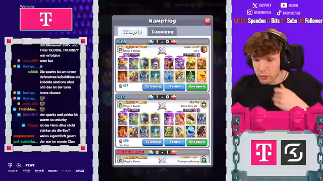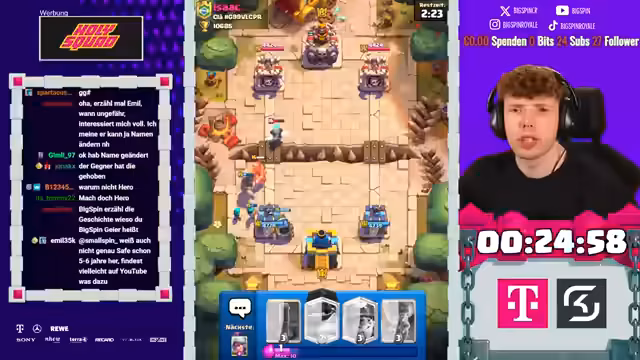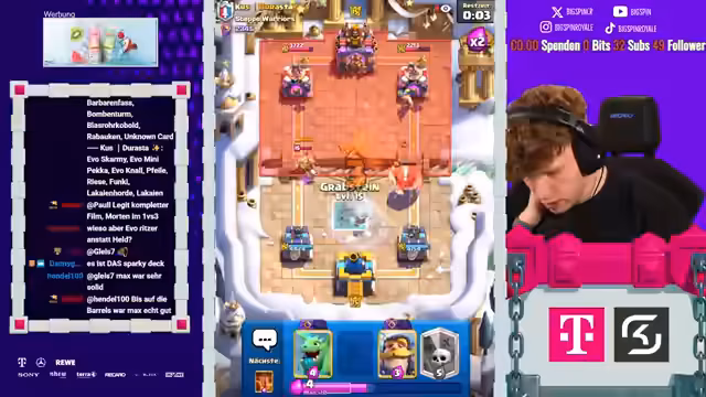01:22:41Die aktuelle Spielrunde ist von intensiven Kämpfen geprägt, wobei der Gegner mit einem Dart-Goblin und einer Prinzessin agiert, die außerhalb der Reichweite des Poisons liegen. Trotz einiger suboptimaler Spielzüge, wie einem schlecht platzierten MK, gelingt es, den gegnerischen Turm zu beschädigen. Die Strategie konzentriert sich auf Graveyard und Poison, um den Sieg zu sichern, was letztendlich mit einem einzigen Skelett gelingt. Nach diesem Erfolg wird direkt die nächste Runde gestartet, in der ein Deck mit Giant, Elite-Barbaren und Rakete zum Einsatz kommt. Allerdings erweist sich die Rakete als nahezu nutzlos, was die Runde zusätzlich spannend macht. Das Team sucht nach einem passenden Gegner und findet Carden aus dem Clan Saul is Glory. Die Kombination aus Hunter und Guards soll für Stabilität sorgen, während der Gegner mit einem Tesla kontert.