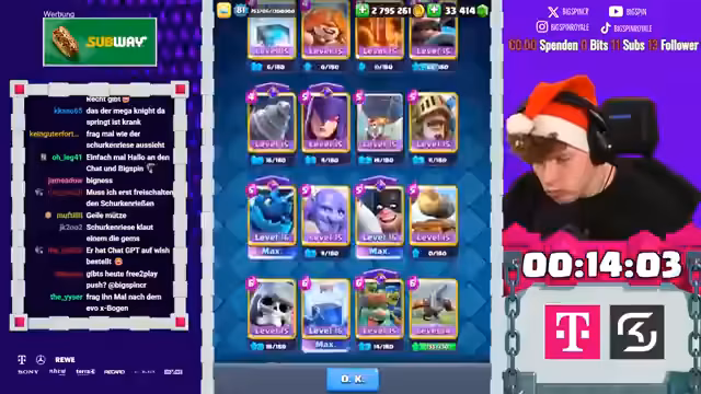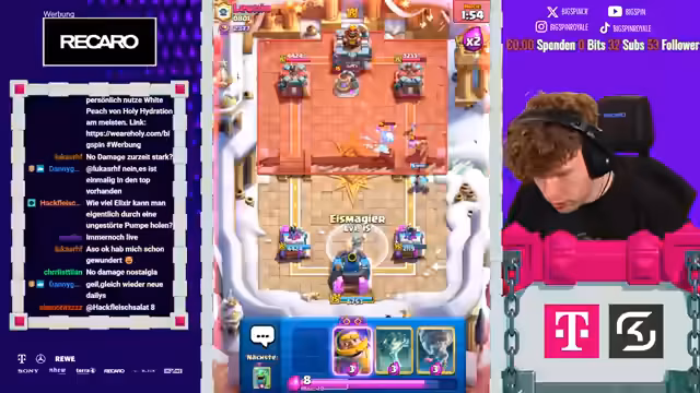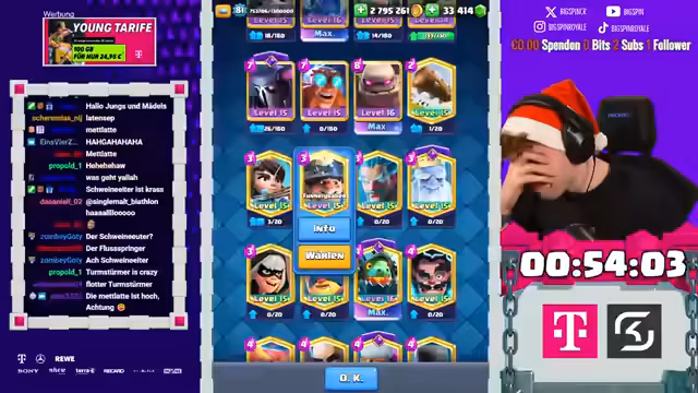 01:51:49Die Serie der Niederlagen setzt sich fort, da der Gegner mit einem „gottlosesten Random Deck aller Zeiten“ gewinnt. Der Frust steigt, da die eigenen Decks nicht die gewünschte Wirkung zeigen. Ein neues Deck mit Labehund wird ausprobiert, in der Hoffnung, die Situation zu verbessern. Die Kombination aus Evo Sepp und anderen Karten soll für mehr Durchschlagskraft sorgen. Der Gegner, Everton Sojo, setzt auf Eisgeist und Crackerin. Ein Ballon und Fledermäuse werden eingesetzt, um Druck aufzubauen. Trotz eines Mighty Miners und eines Teslas des Gegners gelingt es, den Turm zu zerstören und das Spiel zu gewinnen. Die Freude über den Sieg ist groß, und es wird direkt das nächste Spiel mit einem Goblin Giant Pekka 3M Deck gestartet. Der Gegner setzt auf Miner und Prinzessin, was eine Herausforderung darstellt. Die Skarmy und der Inferno-Turm des Gegners erschweren das Vorankommen, doch ein Grabstein und ein Pekka sichern den Sieg.