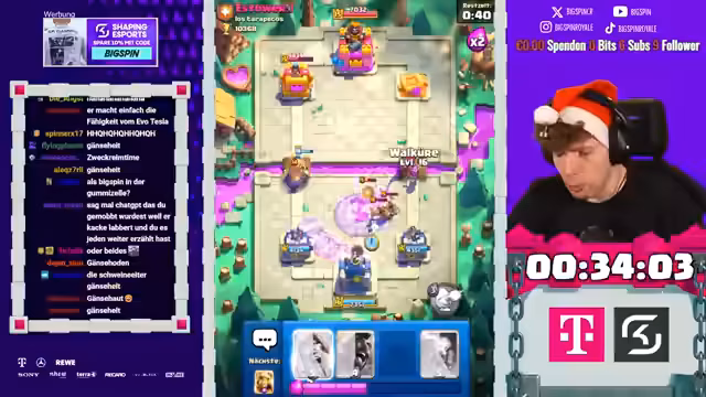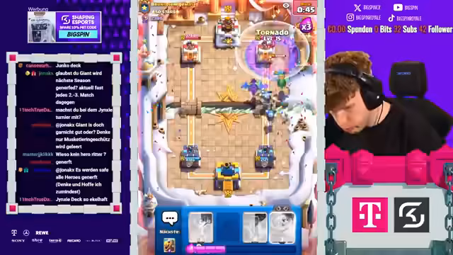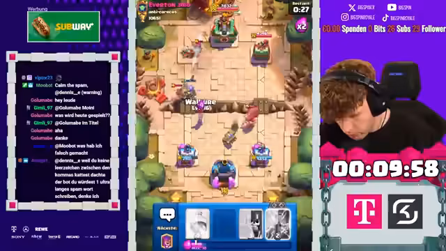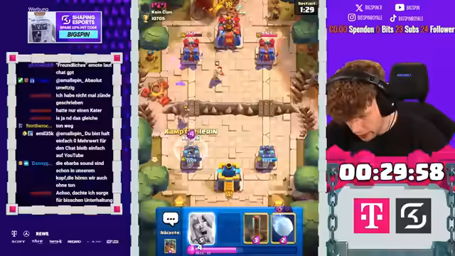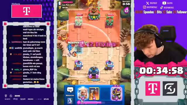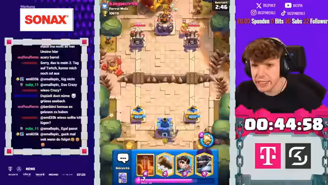 01:33:05Ein neues Deck mit Giant, E-Bub und Heilerin wird getestet, in der Hoffnung, mehr Erfolg zu haben. Das Spiel beginnt gegen einen Gegner mit einem Smiley als Profilbild. Während des Matches kommt es zu einem Ausfall des Sounds, was die visuelle Untermalung der Geschehnisse erschwert. Trotzdem wird versucht, das Spiel zu gewinnen. Der Gegner setzt auf Schweinereiter, gegen die keine passende Handkarte vorhanden ist, was zu einer weiteren Niederlage führt. Der Frust steigt, da die Spiele zunehmend schwieriger werden und technische Probleme die Konzentration beeinträchtigen. Nach einer weiteren Niederlage wird direkt das nächste Match gestartet, um die verlorenen Punkte wieder aufzuholen. Das Team ist entschlossen, die nächsten Runden zu gewinnen und die Strategie anzupassen, um gegen die starken Gegner bestehen zu können.