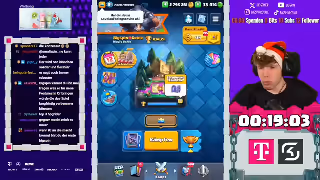 00:00:03Der Stream beginnt mit einer Begrüßung durch Santa Spin, der sich auf unterhaltsamen ChatGPT-Content freut. Nach einer kurzen Ankündigung auf Instagram wird die ChatGPT-Session gestartet, die auf eine Stunde angesetzt ist oder bis ChatGPT das Gesprächslimit erreicht. Es wird thematisiert, dass ChatGPT sich heute auf Deutsch unterhalten soll, um die gewünschten Clash Royale Deck-Empfehlungen zu generieren. Die Vorfreude auf die Zusammenarbeit mit der KI ist groß, um die besten Decks für das Erreichen von 12.000 Trophäen zu finden. Die anfängliche Euphorie wird durch technische Schwierigkeiten mit einem Counter kurz unterbrochen, doch die Session kann bald darauf fortgesetzt werden.