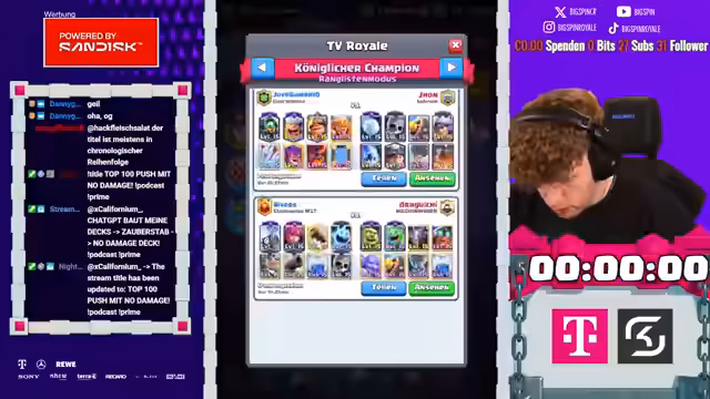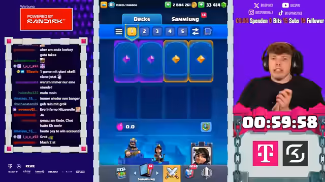 01:58:57Nach einigen Niederlagen wird ein neues Deck mit Golem Freeze und Miner Poison ausprobiert. Die Evo-Bats sollen für mehr Durchschlagskraft sorgen. Der Gegner, Mirko mit 5 O, spielt ein wildes Deck, das einen Mega-Redakt enthalten könnte. Ein Golem wird platziert, gefolgt von einer Hexenmutter. Der Gegner setzt auf Pfeile, doch die Hordebrücke und die Fledermäuse sichern einen schnellen Sieg. Die Freude über den Erfolg ist groß, und es wird das letzte Spiel gestartet. Ein Ramburg-Deck kommt zum Einsatz, wobei der Zauberstab immer wieder den Freeze liefert, was als frustrierend empfunden wird. Der Gegner, Juanca Nummer 7, aktiviert den Kingtower, was die Herausforderung erhöht. Trotz eines Labehunds und Minions gelingt es nicht, den gegnerischen Turm zu zerstören. Das Spiel endet in einer Niederlage, da der Gegner mit Lava-Inferno-Turm und Lock die Oberhand behält. Trotz der Niederlagen wird das „No Damage Deck“ ausprobiert, das von einem Spieler auf Platz 48 der Welt verwendet wird. Das Deck, bestehend aus Graveyard OG und Baby Dragon mit Cage, soll defensiv gespielt werden. Der Gegner, Rambo, setzt auf Boss, Bandit und Henke. Trotz einer defensiven Spielweise und dem Einsatz von Poison und Nado gelingt es nicht, den Gegner zu besiegen. Der Henker des Gegners überlebt alle Angriffe, was zu einer weiteren Niederlage führt. Die Enttäuschung ist groß, da das Deck nicht die gewünschte Wirkung zeigt. Es wird überlegt, wieder auf Golem zu wechseln, falls die nächsten Spiele ebenfalls verloren gehen.