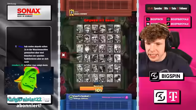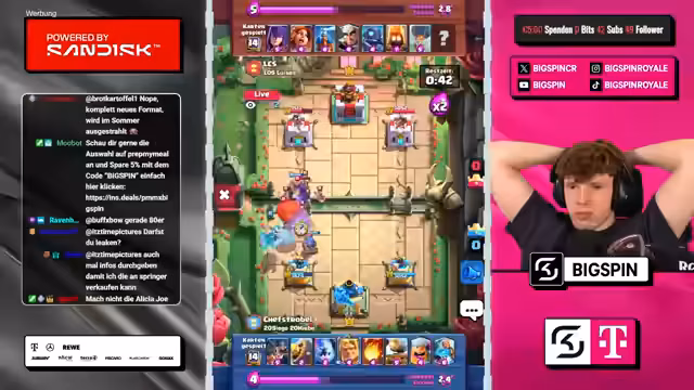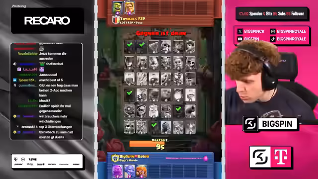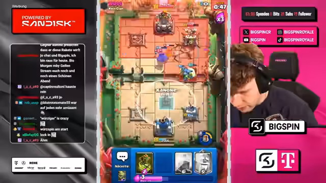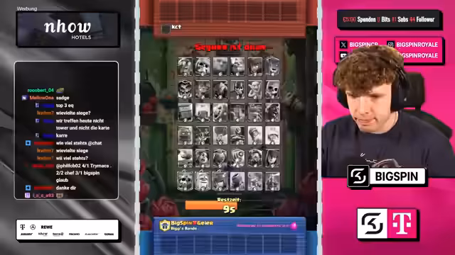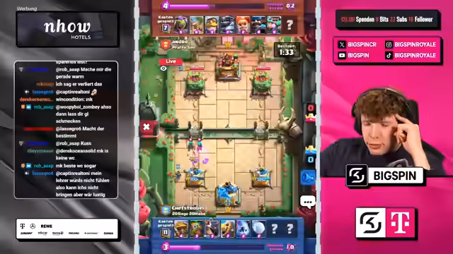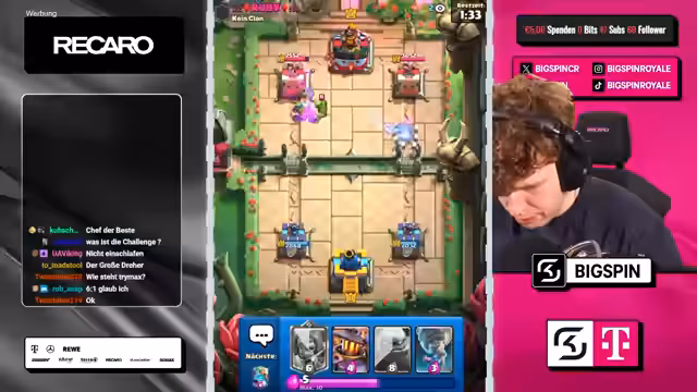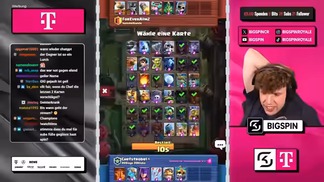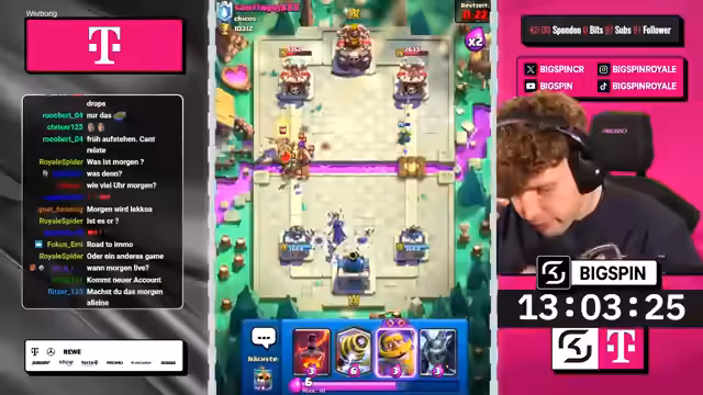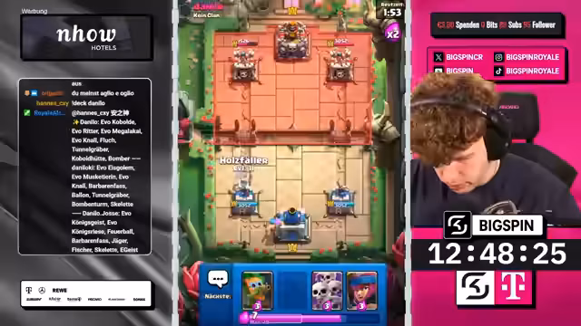 02:05:24Die Streamer kämpfen gegen überraschend starke Gegner, die einen schnellen Sieg erschweren. Chef kritisiert seine Gegner als dumm, da sie wichtige Karten nicht optimal einsetzen, wie den Mönch oder den Royal Giant. Trotz der schwierigen Lage Bigspins, der einige Male knapp Siege einfährt, ärgert sich Chef über die Spielweise der Gegner und die unfairen Situationen. Die Streamer diskutieren über die Stärke der gemachten Picks und die Taktik der Gegner.