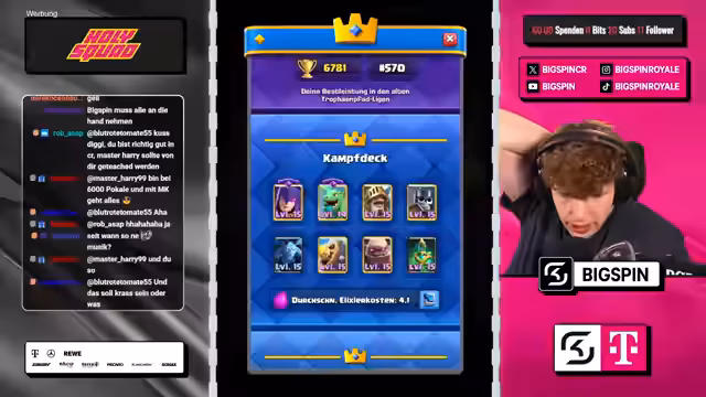 04:00:39Die Streamer analysieren das Gameplay intensiv. Es wird diskutiert, warum ein Spieler nur zwei Truppen spielt, obwohl er mehr Karten hat. Chef Strubel gibt Taktiktipps und warnt davor, dem Gegner auch nur eine einzelne Elixier-Karte zu geben, da dies das Spiel sofort zugunsten des Gegners entscheiden könnte. Es wird über die Stärke von Karten wie dem Bowler und den Mangel an defensiven Gebäuden gesprochen.