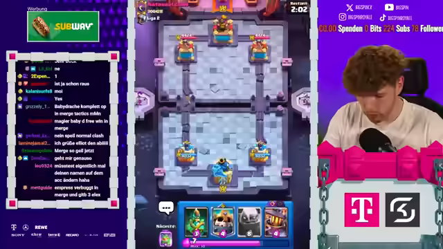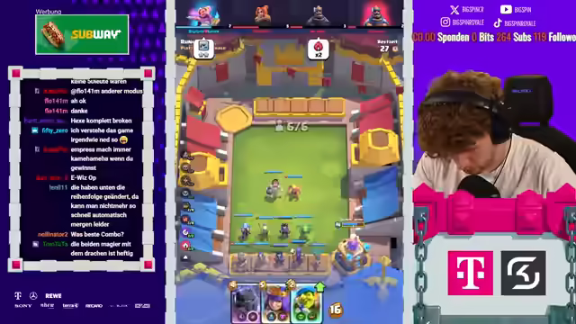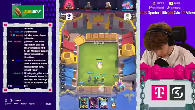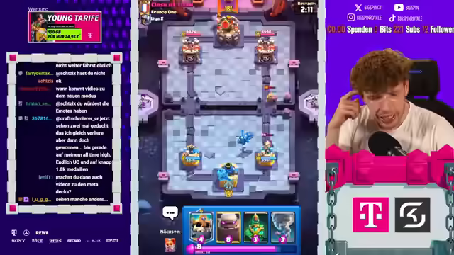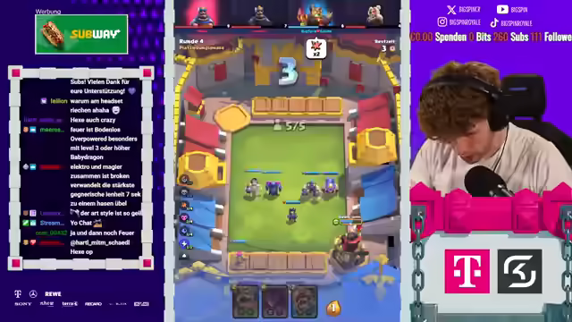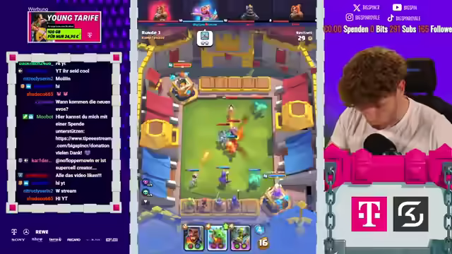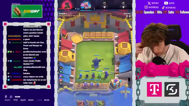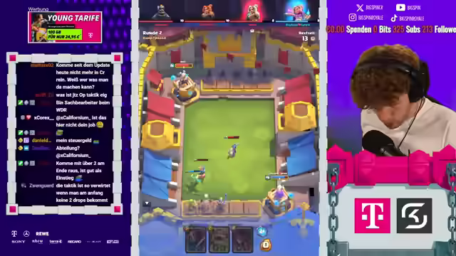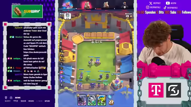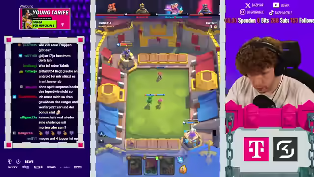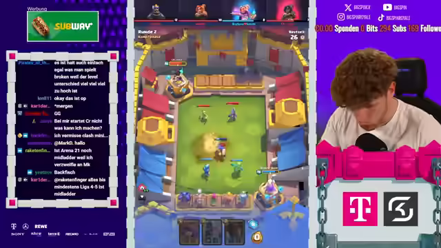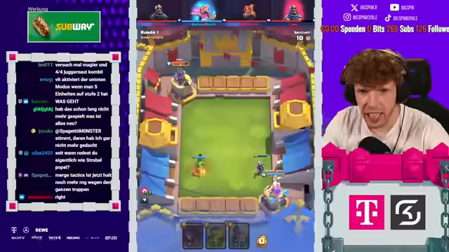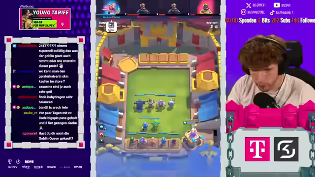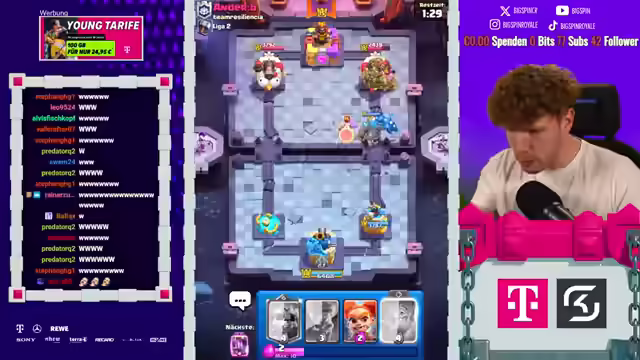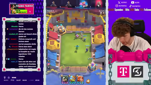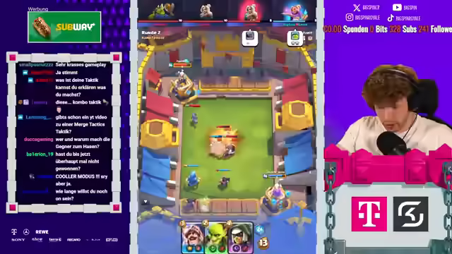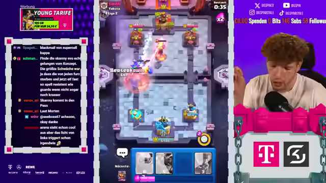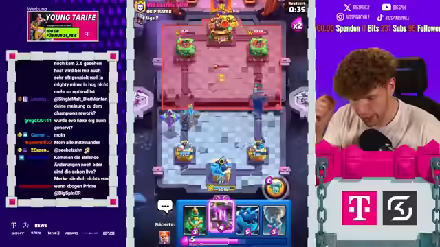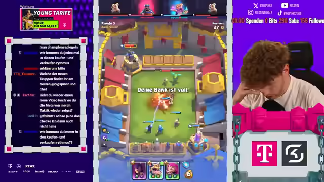 02:34:45Es wird Lena für 5 Subs gedankt und auf die Möglichkeit hingewiesen, Code Big Spin einzutragen, wenn man Cosmetics in Merch Tactics kauft. Am Anfang des Spiels gibt es wieder Probleme, und es muss akzeptiert werden, dass man aufs Maul kriegt. Es wird versucht, durchzucyclen und Scallydecks und Bogenschützenden zu kaufen. Es gibt wieder Pech, und es wird gefressen. Es muss erst wieder in Fahrt kommen. Der Bug, der drei Elixier für die Fusions gibt, wird als sehr krass bezeichnet. Es wird überlegt, was man kaufen soll. Die Runde wird als sehr vom Pech verfolgt beschrieben. Es wird sogar die Queen verkauft, um zu Magio zu kommen. Es kann nichts weiteres verkauft werden, da irgendwie gewonnen werden muss. Es wird gegen den Ersten gespielt, und es darf keine Truppe verloren werden. Es wird maximales Pech vermutet. Es wird die Musketieren gekauft, wieder die günstige Truppe. Das Einzige, was dieser Taktik wirklich passieren kann, ist, dass man maximales Pech hat. Ansonsten kann man gefühlt eigentlich nicht hiermit verlieren. Es wird stabil gespielt, und der Magier besiegt den Gegner 1 gegen 1. Es wird wieder die große Grundlage geschaffen. Es wird überlegt, die Skele-Rex zu kaufen. Es gibt ein leichtes Cycle-Problem. Es wird das Elixier aufbewahrt, um keinen Verlust zu erleiden. Es wird auf den Merch gewartet.