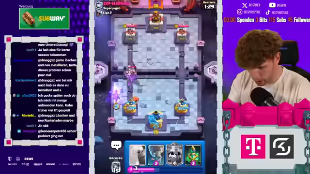 00:06:13Die Liga ist schwerer geworden, da man 15.000 Trophäen erreicht haben muss, um sie spielen zu können. Im ersten Spiel wird gegen einen Gegner mit Mini-Pekka gespielt, was problematisch ist, da keine passende Karte im Deck vorhanden ist. Trotzdem wird versucht, mit dem Golem und Evolutionen gegenzuhalten, mit dem Ziel, in dieser Season Ultima T-World Champion zu erreichen oder zumindest Liga 6. Das erste Spiel geht jedoch verloren, da das Deck anfällig gegen Mini-Pekka ist. Die Gegner sind Full-Max und scheinen die Schwächen des Decks zu kennen. Im nächsten Spiel wird gegen Lockbait gespielt, was ebenfalls interessant werden könnte. Es wird eine interessante Situation mit aktiviertem Kingtower beschrieben, aber es gelingt nicht, den gegnerischen Turm anzugreifen. Das Deck hat in der einfachen Elixierphase Schwierigkeiten, da die Gegner mit ihren zufälligen Zügen Vorteile erzielen können. Es wird angekündigt, dass am Ende der Season Merch-Tactics und Free-to-Play auf dem Main-Account gespielt werden. Es wird überlegt, den Skellyking aus dem Deck zu nehmen und stattdessen die Bossbanditen einzusetzen, da der Skellyking nicht die gewünschte Leistung bringt, besonders gegen die OP-e Brokene Evo-Valküre.