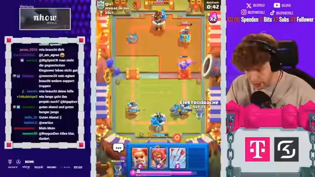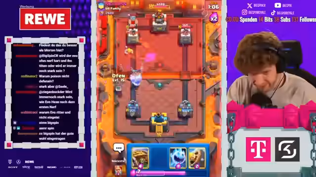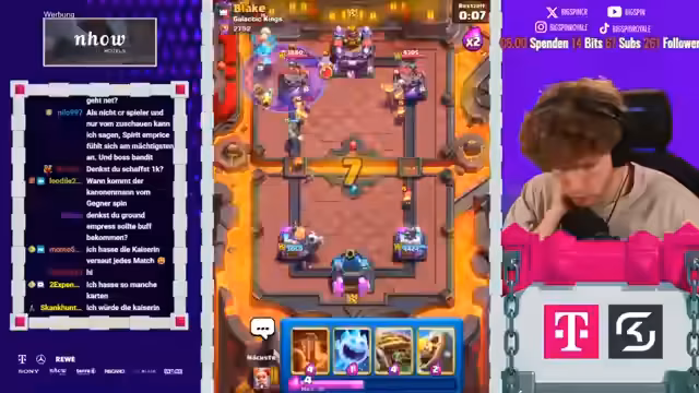 02:40:38Die weiteren Spiele verlaufen durchwachsen. Der Streamer sieht sich mit mehreren schwierigen Matchups konfrontiert, insbesondere gegen Geisterkaiser-Decks und aggressive Builds. Er kritisiert eigene Spielzüge, die er als "Circus-Sieg" oder "krass" bezeichnet. Trotzdem gelingt es ihm, kontinuierlich Damage zu machen und die Trophäenanzahl zu erhöhen. Er diskutiert verschiedene strategische Ansätze, wie zum Beispiel die defensive Haltung oder den richtigen Zeitpunkt für einen Giftzauber, aber fühlt sich in manchen Spielen machtlos.