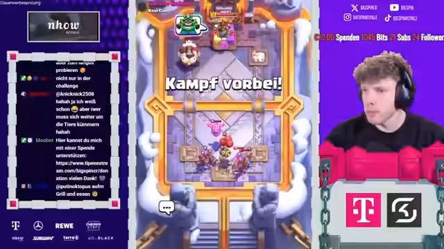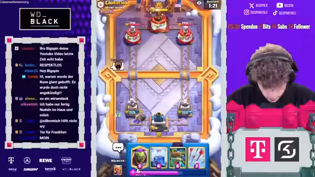 01:54:40In den folgenden Spielen tritt eine Phase der Inkonsequenz auf. Während der Streamer einige Gegner souverán dominiert und ihre Türme schnell eliminiert, verliert er andere Games durch eigenes Fehlverhalten oder unerwartete gegnerische Karten. Einige Male wird er durch Evolutionen wie den Elektrodrachen oder durch geschickte Verteidigungen überrascht, was ihn zu kritischen Analysen seiner eigenen Spielzüge und der Matchups veranlasst.