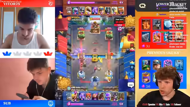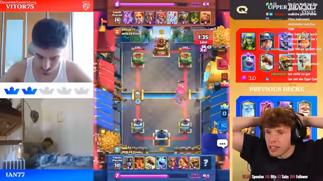 04:28:40Nach drei intensiven Spielen gewinnt Ian klar mit 3-0 gegen Vitor und sichert sich damit das Ticket für die Grand Finals und die World Finals. Das Turnier zeigt eindrucksvoll, wie wichtig Matchups in Clash Royale sind und wie schnell das Blatt sich wenden kann. Spieler wie Mo Light und Lucas X-Gamer scheiden früh aus, während Ian konstant überzeugt. Nächster Schritt im Turnier sind die Best-of-5-Duels, die noch vorstehen.
