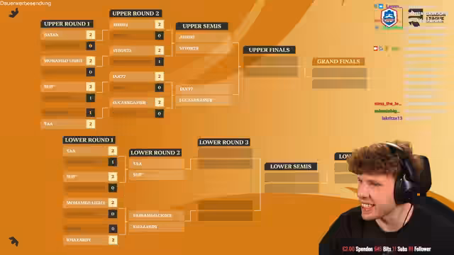 01:24:50Der Stream startet mit der Vorstellung des 15.000-Gems-Turniers. Es werden die Upper-Bracket-Matches zwischen Adriel gegen Vitor und Ian gegen LucasXGamer sowie die Lower-Bracket-Matches zwischen Tar gegen Sub und Mulight gegen Ego genannt. Insgesamt werden 10 Spiele stattfinden, ab den Lower Semifinals, Lower Finals, Upper Finals und Grand Finals alles in Best-of-5-Formaten. Mo Light hat nach einer Niederlage gegen Vitor eine schwierige Ausgangslage und muss sich nun bemühen, ins Turnier weiterzukommen.