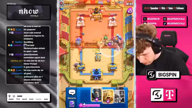 00:29:41In der nächsten Runde steht ein Ballon-Deck auf dem Programm. Der Streamer erkennt die Gefahr, die von den drei Musketieren und einem eventuellen Inferno-Turm ausgeht. Trotz defensiver Maßnahmen und dem Versuch, den gegnerischen Turm anzugreifen, gerät das Team in eine starke defensive Position. Ein knappes, verlorenes Spiel gegen ein 3M-Deck ist die Folge, was die Tatsache unterstreicht, dass nicht jedes kopierte Deck automatisch zum Sieg führt.