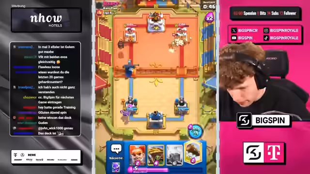 02:38:07Der Streamer startet mit einem neuen E Giant Deck, das er von einem anderen Spieler kopiert hat. Das erste Verluste sind frustrierend, aber er bleibt motiviert und wechselt zu einem Vogelbildendeck, um wieder in das Spiel zu kommen. Der Fokus liegt darauf, mit einem kürzlich gelernten Deck erfolgreich zu sein und in der Liga aufzusteigen. Die Matchups sind teilweise unklar und fühlen sich zufällig an, was den Streamer verärgert.